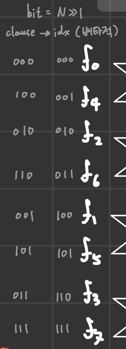 f(k)항의 k를 2진법 전개해보면 비트를 대칭적으로 역전시켰을 때, 최종 배치가 된다.