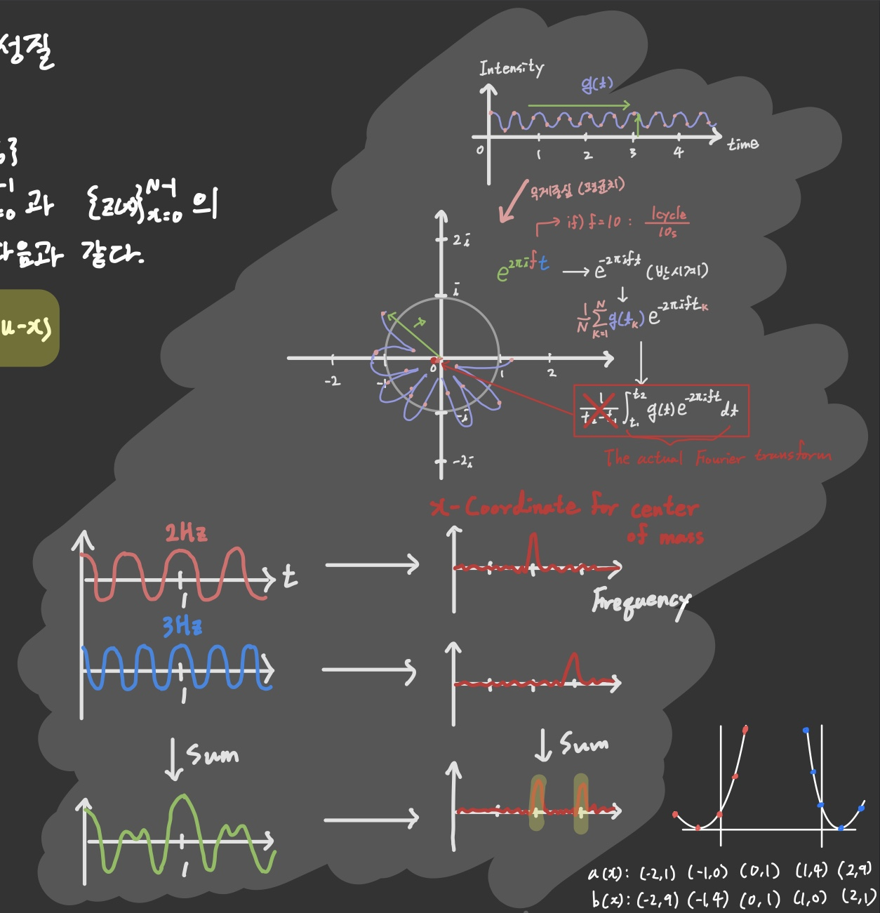그러면 sampling된 그래프가 질량을 가진다고 가정하고 복소수 좌표를 감싸듯이 그리면 무게 중심의 이동을 알 수 있다.