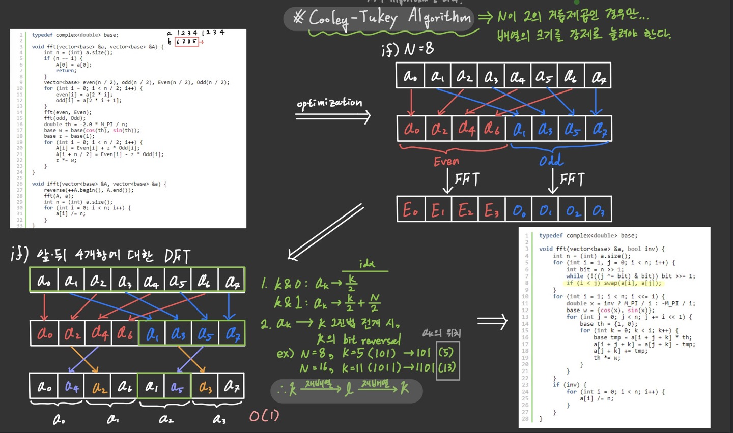 FFT의 대표적인 알고리즘은 Cooley-Tukey Alogorithm을 사용하는데 이 알고리즘은 N이 2의 거듭제곱인 경우에 사용될 수 있기 때문에 우선 배열이 2의 거듭제곱 크기만큼 있다고 치자.