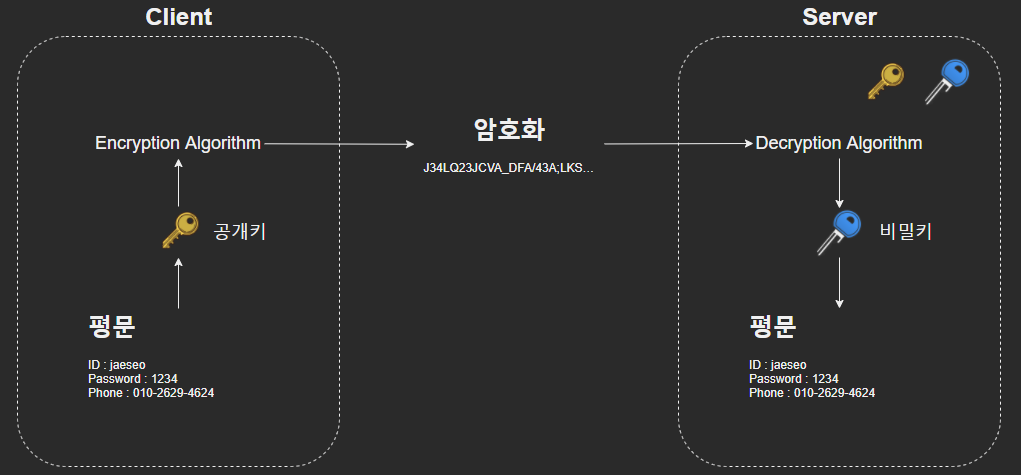 - 공개키 암호화: 개인키로만 복호화 가능하며, 개인키를 소유한 Server만 확인할 수 있다.