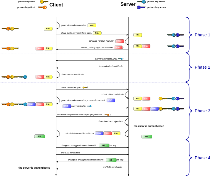 - Client는 세션키를 보관하며, 추가로 Server측의 public key로 세션키를 암호화하여 Server로 전송