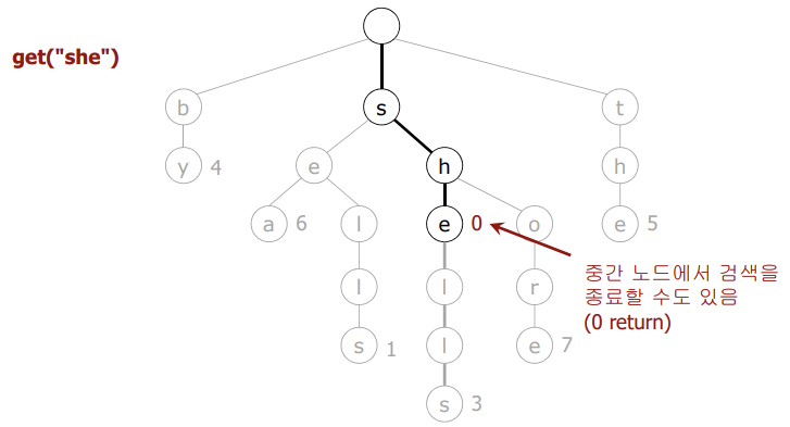 - key의 문자와 Node의 문자를 비교하면서 링크를 탐색한다.