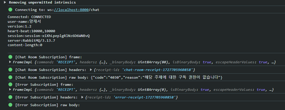 | `24.10.01 | • Authorize Subscribe Interceptor 작성 • 디자인 패턴을 적용한 ExceptionHandler 리팩토링 • PreAuthorize를 사용한 Controller 자원 접근 권한 검사 |