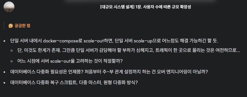 - 책을 정리하면서 분명히 모르거나, 의문이 생기는 부분들이 있을 텐데, 이에 대한 어떠한 고민의 흔적조차 남아있지 않다면 그냥 타이핑을 열심히 한 사람밖에 안 된다.