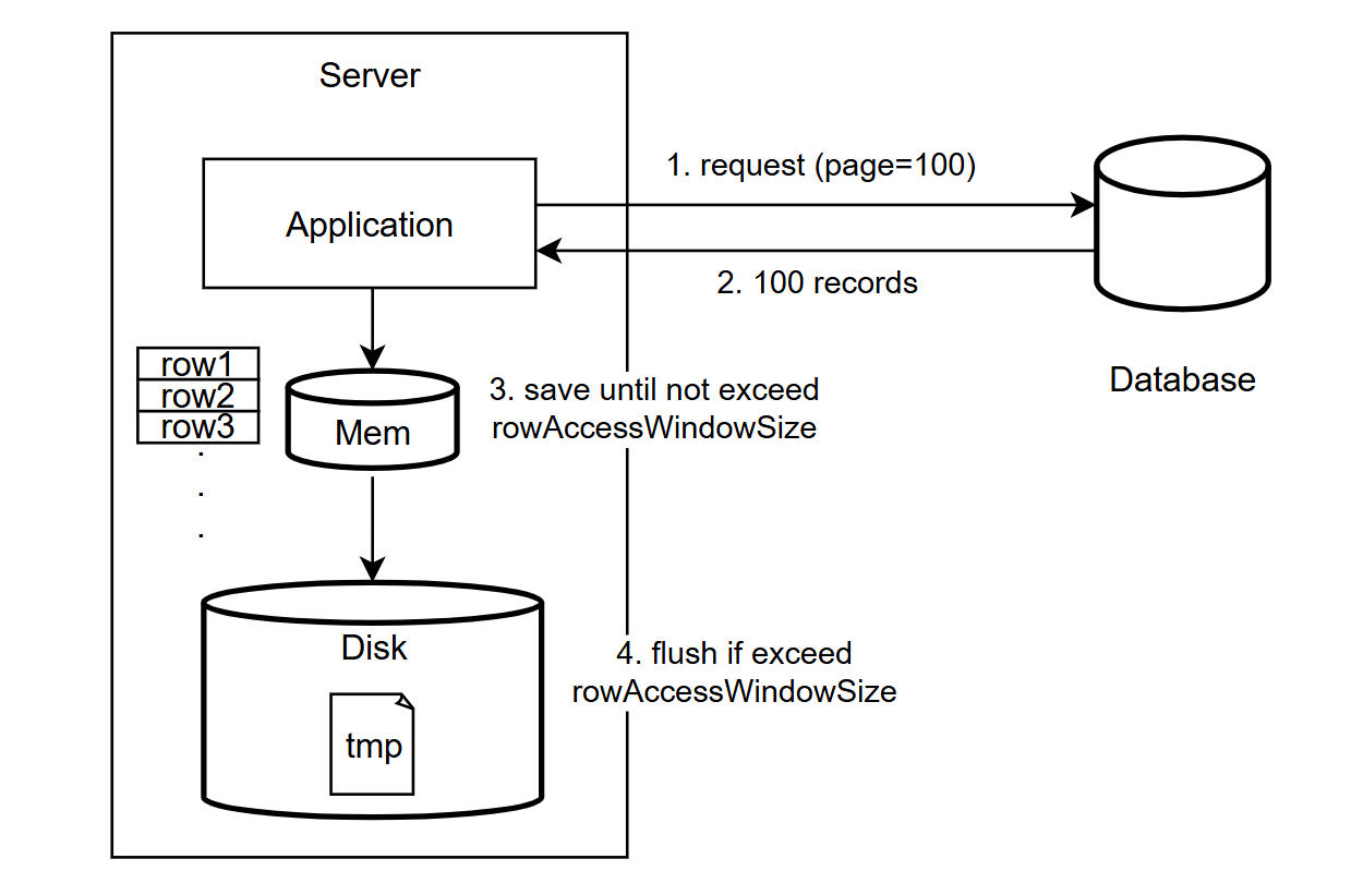 그렇기 때문에 데이터 양이 메모리 크기를 오버하는 순간 OOM이 발생할 우려가 있었는데, SXSSFWorkbook은 이러한 문제를 해결하기 위해 rowAccessWindowSize를 생성자에서 입력받도록 처리했다.