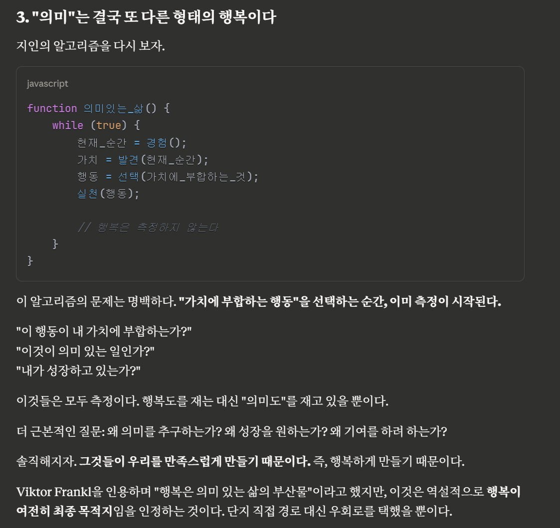 이렇게 되면 행복은 찾아오지 않던 변수가 아니라, 이미 실행 중이던 함수의 자연스러운 반환값이 된다.