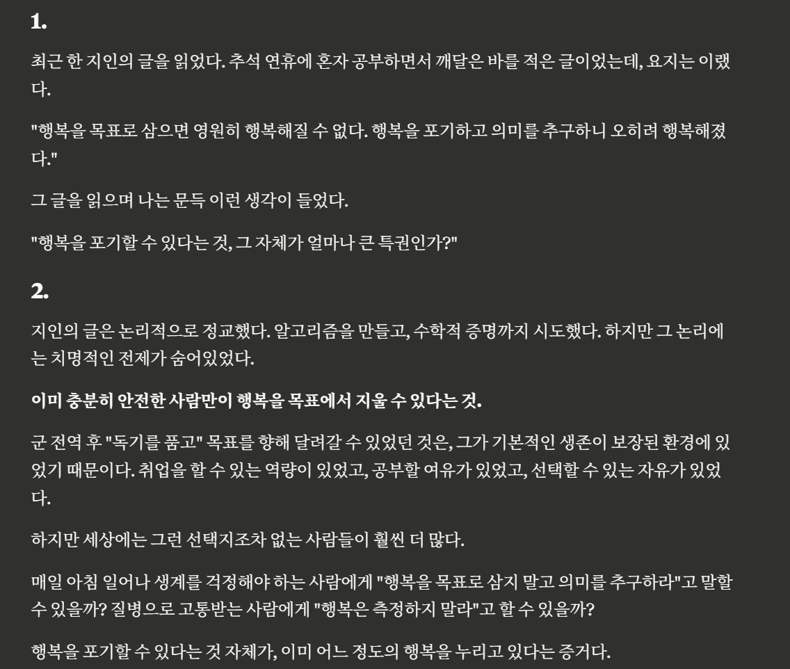그리고 이는 "나는 지금 행복하지 않다"는 전제를 필수적으로 깔고 시작하기에 가능한 사고 흐름이다.