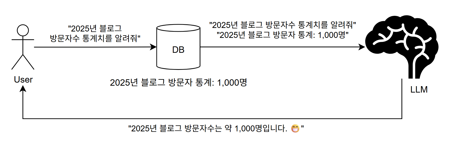 사용자 질문에 미리 저장해둔 연관된 정보들을 조회하여 context를 추가로 전달해주며, 만약 Vector DB의 최신화가 이루어지지 않으면 LLM은 다시 고립된 천재로 회귀한다.