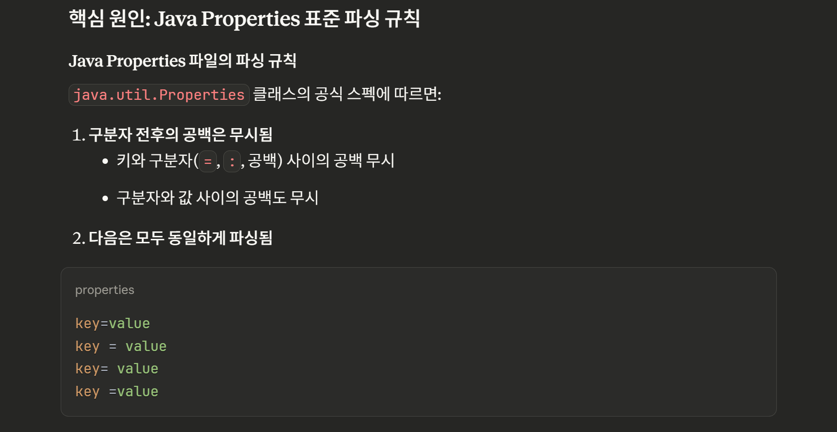 정답을 먼저 적어놓자면, 이건 java의 스펙이 맞고 java.util.Properties L345의 load0 함수에서 확인할 수 있다. (위는 틀렸고, 아래가 맞다)