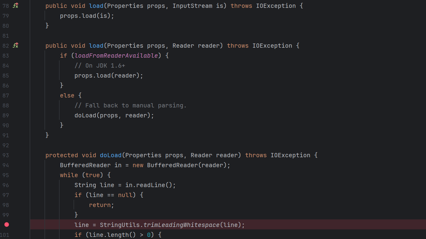 org.springframework.util.DefaultPropertiesPersister에서 load를 호출하면, doLoad()가 아니라 Properties의 load를 호출하는데 엉뚱한 곳을 찍고 있었던 것.