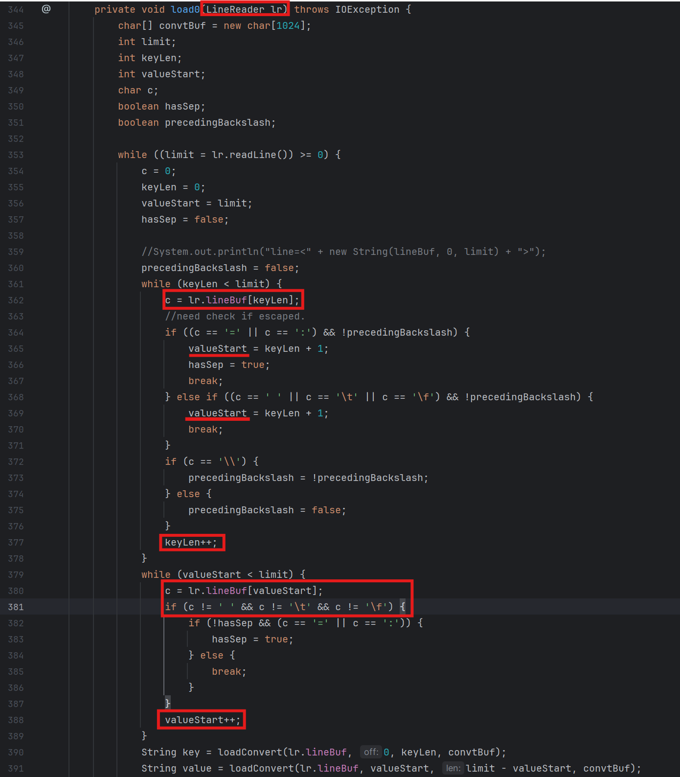 "server.url= http://localhost.com"의 경우 ['s', 'e', 'r', 'v', 'e', 'r', '.', 'u', 'r', 'l', '=', ' ', 'h', 't', 't', 'p', ':', '/', '/', ...] 형태로 읽히는데, 첫 번째 while문에서는 구분자 "=", ":" 혹은 공백인 경우에 바로 다음 인덱스를 value의 시작 인덱스로 취급한다.