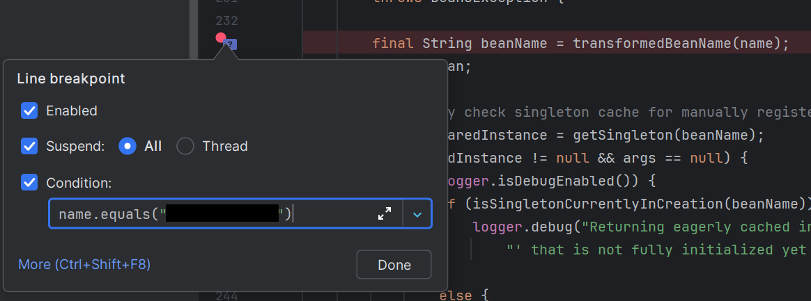 beanName.equals("properties 이름")으로 break point를 적절하게 찍을 위치만 선정하면 된다.