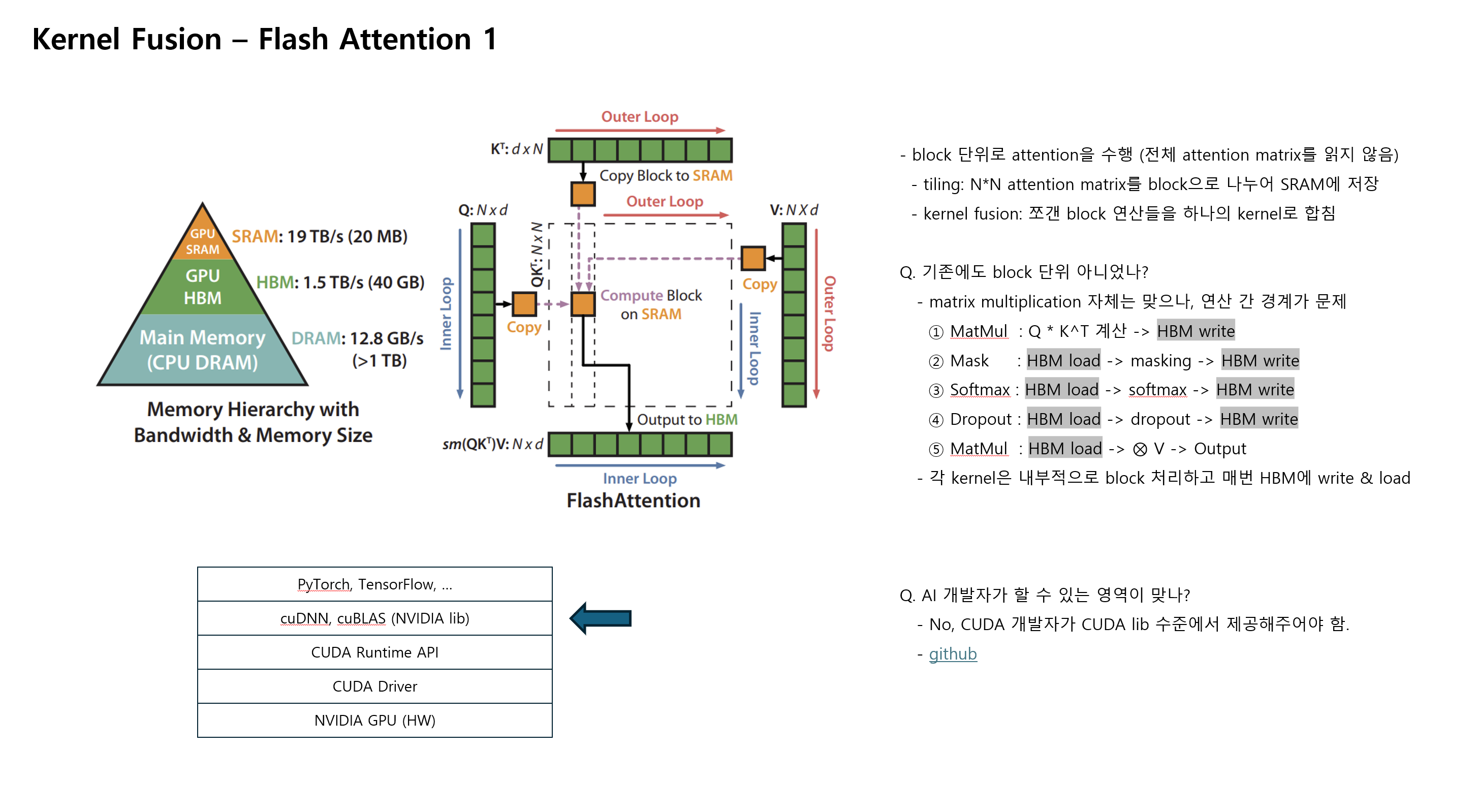 - CUDA 개발자가 NVIDIA LIB 수준에서 attention 전체를 하나로 합친 커스텀 CUDA kernel을 추가해줘야 함.