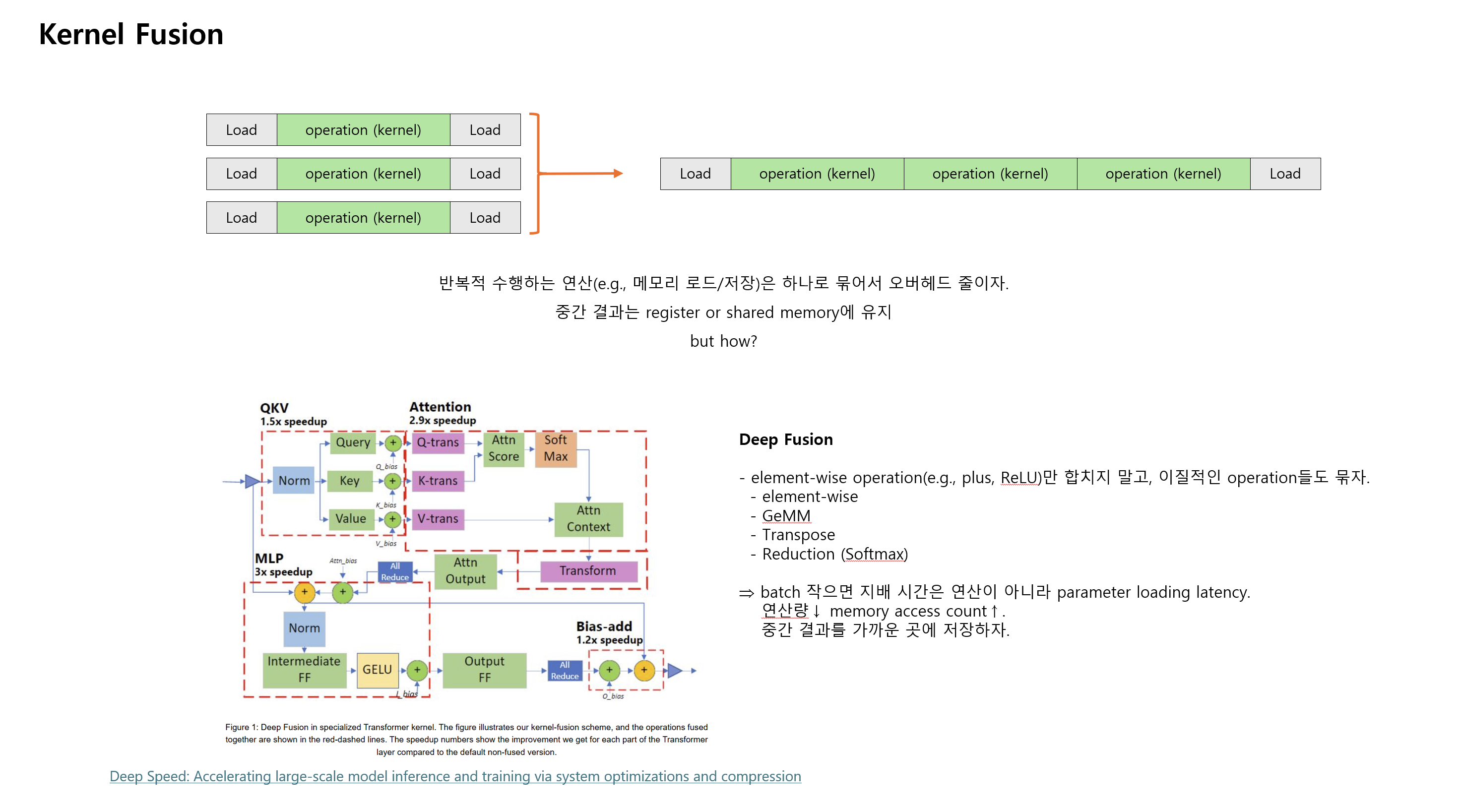 - kernel fusion으로 쪼갠 block 연산들을 하나의 kernel로 합침