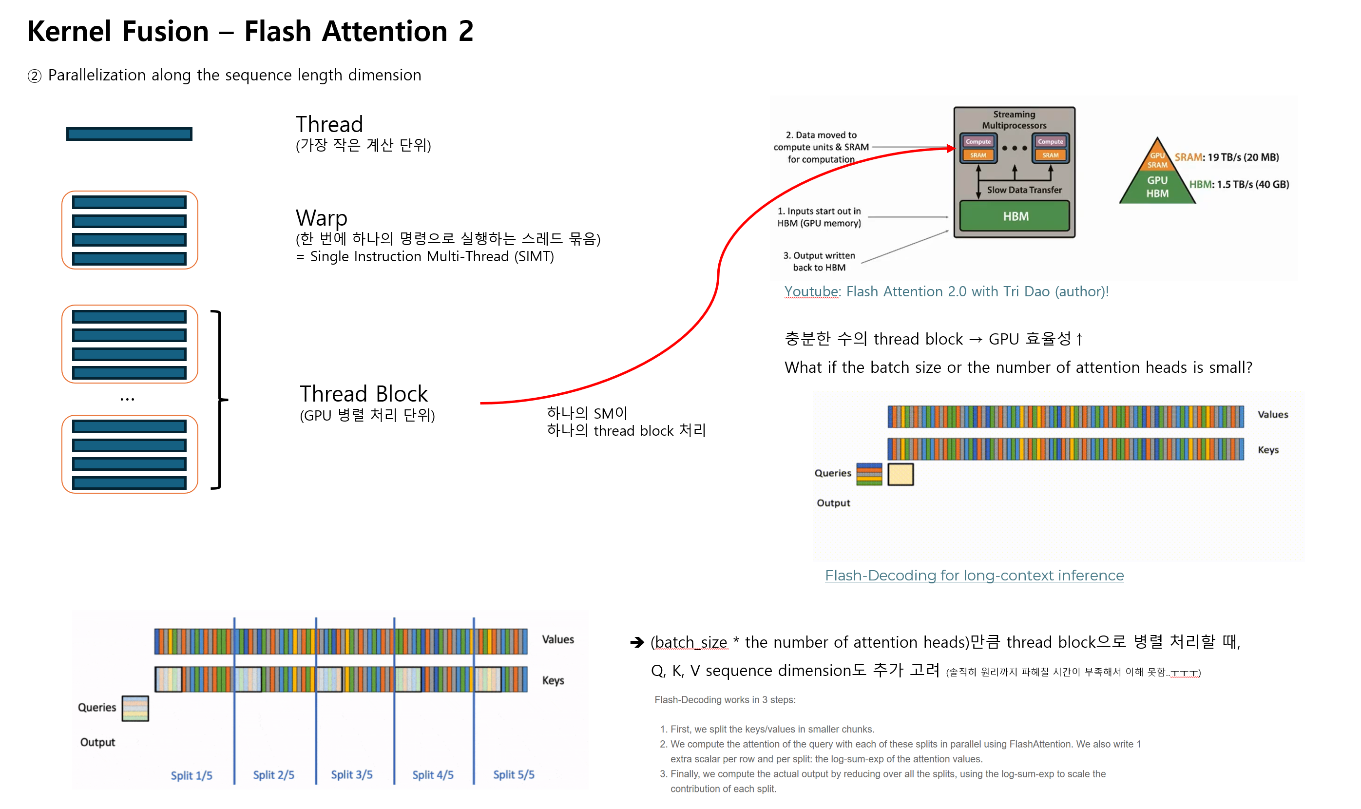 - batch size가 작거나, 어텐션 헤드 수가 작아서 충분한 수의 thread block을 모으지 못하면, GPU의 SM을 충분히 활용하기 어려움