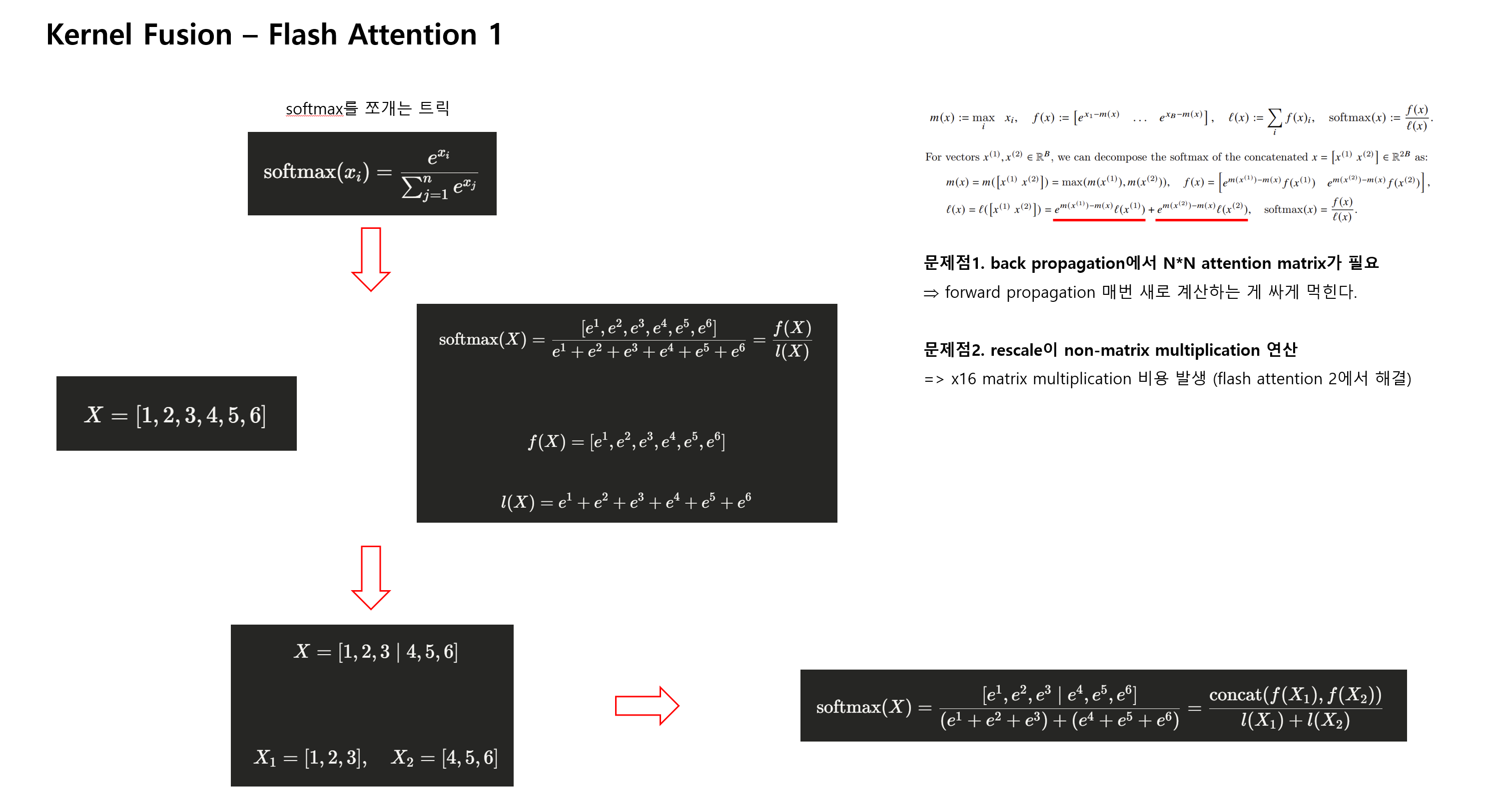 - softmax 연산을 분할하는 트릭을 보는 게 묘미.