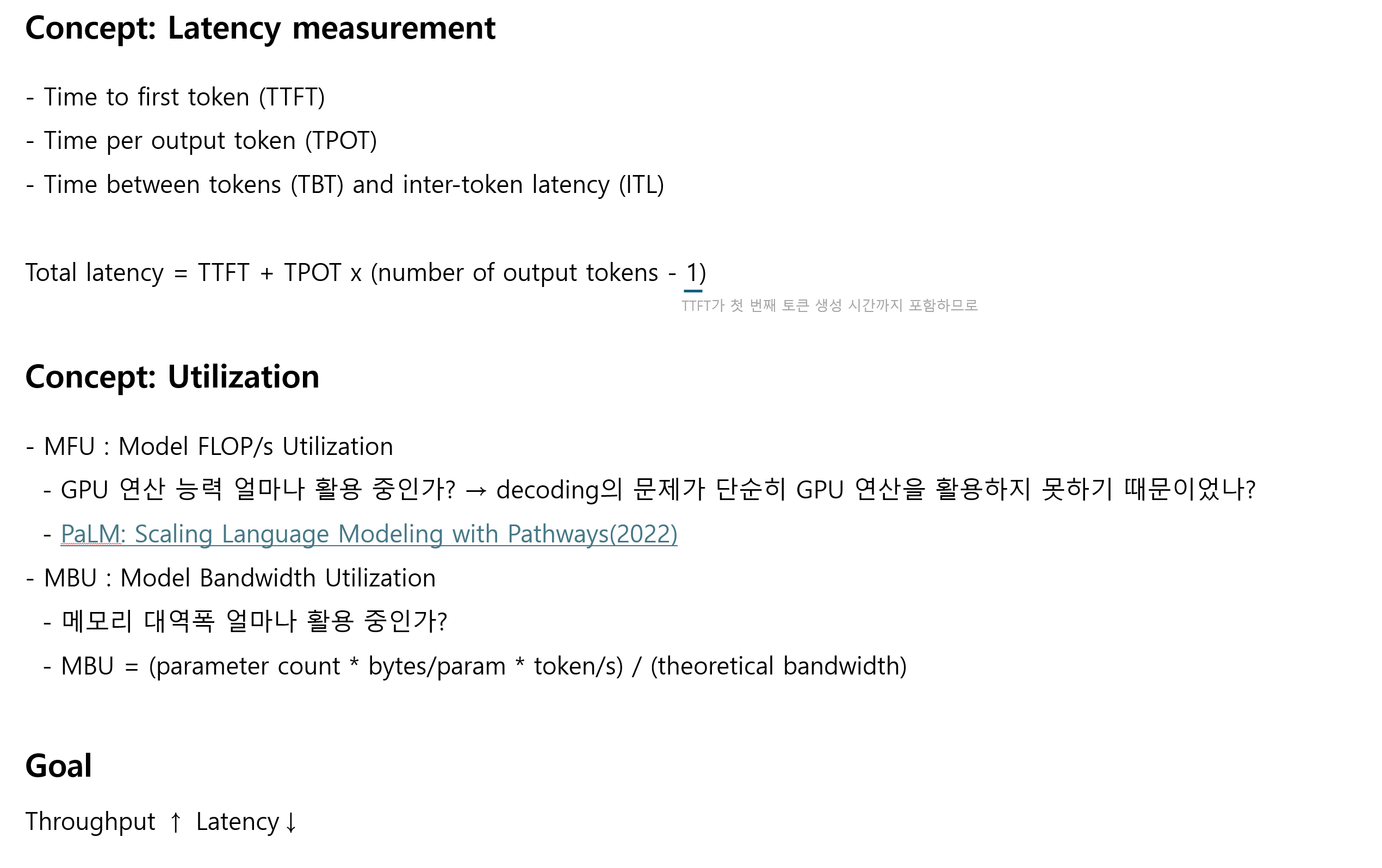 - 비효율적으로 돌아가는데 단순히 열심히 계산하다고 MFU 높고, Bandwidth 문제인데 GPU 활용도가 떨어진다고 측정될 수 있음. -> 그래서 MBU 개념이 등장함